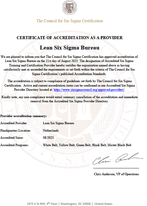 The Council for Six Sigma Certification provides Six Sigma accrediting services to more than 165 countries around the world. To learn more about us, we encourage you to review our Accreditation Standards, the required Body of Knowledge, and our Ethical Transparency pages.